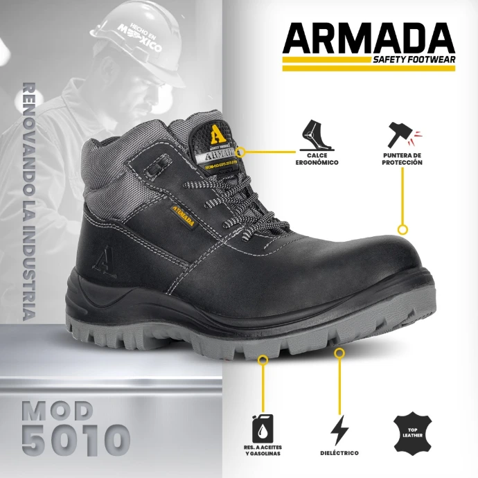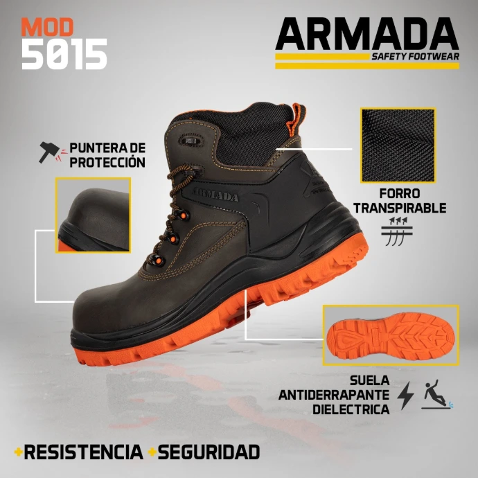 Modelo con enfoque en protección y resistencia para trabajo industrial, con puntera de policarbonato, propiedad dieléctrica y fabricación en piel natural para un desempeño confiable en campo y operación diaria. Su construcción tipo Strobel / inyección al corte la vuelve una alternativa sólida para empresas que buscan un calzado de seguridad durable, con imagen robusta y uso versátil en industria, mantenimiento y operación general.